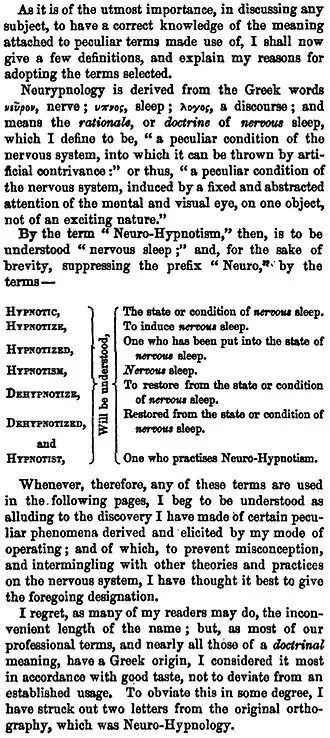 - I therefore think it desirable to assume another name [than animal magnetism] for the phenomena, and have adopted neurohypnology – a word which will at once convey to every one at all acquainted with Greek, that it is the rationale or doctrine of nervous sleep; sleep being the most constant attendant and natural analogy to the primary phenomena of mesmerism; the prefix "nervous" distinguishing it from natural sleep. There are only two other words I propose by way of innovation, and those are hypnotism for magnetism and mesmerism, and hypnotised for magnetised and mesmerised.