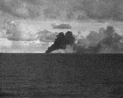 Chiyoda was crippled by four bombs dropped by aircraft from the carriers USS Franklin and USS Lexington that left her dead in the water. The converted hybrid battleship-carrier Hyūga attempted to take her in tow, but was prevented by a third attack. The cruiser Isuzu was ordered to remove Chiyoda's crew, but this was also frustrated due to continuing danger from air and surface attack. After three attempts, Isuzu was forced to retreat with U.S. surface forces in sight and Chiyoda under naval gunfire.[3] She was finished off by gunfire from four cruisers, USS Santa Fe, Mobile, Wichita and New Orleans,[5] along with nine destroyers, all under the command of Rear Admiral Laurence DuBose.[3][6] No survivors were permitted to be rescued,[7] and Captain Jō Eiichirō and the entire crew of 1,470 officers and men went down with the ship at position 19°20′N 126°20′E / 19.333°N 126.333°E / 19.333; 126.333. Chiyoda was removed from the navy list on 20 December 1944.[3]