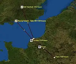 They first attempted the raid on 13 May, but encountered poor weather after crossing the French coast. They were under orders to return if this happened. On 12 June 1942, Gatward and Fern took off again at 11:29 hours from RAF Thorney Island in heavy rain. Initial weather conditions of ten tenths cloud at 2,000 feet with heavy precipitation were encountered and the aircraft set course for the target at 11:31 hours. Crossing the French coast a few miles eastward of Fécamp at 11:58 hours, the cloud cover thinned out and by the time they reached Rouen there was bright sunshine. With excellent visibility the aircraft passed over the suburbs of Paris at a very low altitude and some light flak was encountered for the first time. He circled the Eiffel Tower at 12:27 hours. During this low-level flying he suffered a bird strike in his starboard engine radiator, but managed to fly on. At approximately 12:28 hours he banked to port and headed towards the Champs-Élysées.[3]