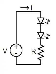 Schematic with a voltage power source (with voltage V), LED, resistor (with resistance R), and current flow (I).