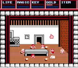 The characters in Legacy of the Wizard must utilize several magical items in their quest. These can be acquired from chests or bought in shops that are sometimes located in very impractical locations. Item effects include restoring the character's health and magic power, boosting attack power or range, or environmental effects like enabling the character to fly or move special bricks. Some items can only be used by certain characters, and since accomplishing the goals requires the use of these items, it is up to the player to determine which character must be used to regain each crown. Acquiring these items and finding how to properly use them is the essence of Legacy of the Wizard.