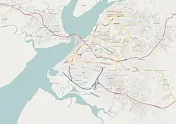 Floating Quai | Deïdo Plage, Bonamouti-Deïdo | 2013–2014 | Juan Fernando Herran | proximity artwork | a wooden scaffolding on the bank of the Wouri river made of several pontoons recalling the shape of traditional canoes.[25][21][30] | Floating Quai is a work by the Colombian artist Juan Fernando Herran, started for SUD 2013, and continued in January 2014 by the architect Mauro Lugaresi. However today the work is not finished yet, according to the initial project. It is a wooden scaffolding on the bank of the Wouri river made of several pontoons recalling the shape of traditional canoes. With this work the artist wanted to pay homage to the fluvial tradition of Bonamouti dwellers, a population of fishermen who still today make use of dugouts (traditional canoes carved into the wood) to run their business. The floating dock offers a foothold and shelter for canoes, allowing fishermen to land on the shore regardless of the tide. Artwork commissioned in the frame of SUD Salon Urbain de Douala. The work was presented during the SUD Salon Urbain de Douala 2013.