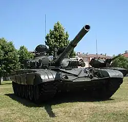 The M-84 is based on the Soviet T-72M, the export variant of T-72A, brought to T-72M1 standard,[1] with many improvements, including a domestic fire-control system that the T-72M lacked, improved composite armor, and a 1,000-hp engine.[2] The M-84 entered service with the Yugoslav People's Army in 1984, and the improved M-84A version entered service a few years later, the M-84A housing an upgraded engine.[1] Other variants were introduced later, most being modernization packages.