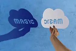 Ambigram Magic / Dream with a handheld pattern giving a reversed shadow by mirror symmetry. "It's all done with smoke and mirrors," as we say to explain something baffling.