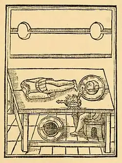 An illustration from Reginald Scot's The Discoverie of Witchcraft (1584), one of the earliest books on magic tricks, explaining how the "Decollation of John Baptist" decapitation illusion may be performed