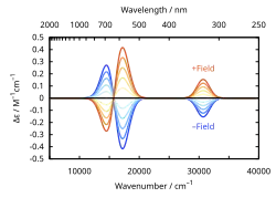 where is the intensity of light at position , is the absorption coefficient of the medium in the direction, and is the speed of light. Circular dichroism (CD) is then defined by the difference between left () and right () circularly polarized light, , following the sign convention of natural optical activity. In the presence of a static, uniform external magnetic field applied parallel to the direction of propagation of light,[2] the Hamiltonian for the absorbing center takes the form for describing the system in the external magnetic field and describing the applied electromagnetic radiation. The absorption coefficient for a transition between two eigenstates of , and , can be described using the electric dipole transition operator as
