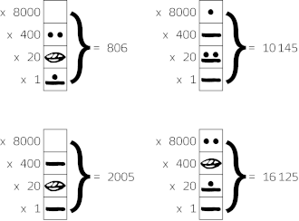 These four examples show how the value of Maya numerals can be calculated.