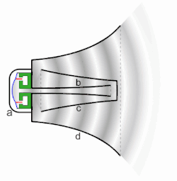 A megaphone, speaking trumpet, bullhorn, blowhorn, or loudhailer is usually a portable or hand-held, cone-shaped acoustic horn used to amplify a person's voice or other sounds and direct it in a given direction. The sound is introduced into the narrow end of the megaphone, by holding it up to the face and speaking into it, and the sound waves radiate out the wide end. A megaphone increases the volume of sound by increasing the acoustic impedance seen by the vocal cords, matching the impedance of the vocal cords to the air, so that more sound power is radiated. It also serves to direct the sound waves in the direction the horn is pointing. It somewhat distorts the sound of the voice because the frequency response of the megaphone is greater at higher sound frequencies.