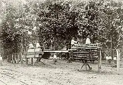 In 1908 and 1909, the forester H. J. L. Beck built a manually operated monorail of limited but sufficient capacity for the transport of small timber and firewood in the northern Surabaya forest district. In later years, this idea was further developed by L. A. van de Ven, who was a forester in the Grobogan forest district (north of Poerwodadi 7°01′51″S 110°55′14″E / 7.03089°S 110.92061°E) around 1908–1910.[1][2] He devoted himself to the planning, construction and operation of monorails,[3] especially monorails with larger capacity for heavier transport. His consideration was that the construction and maintenance of monorails in hilly terrain, apart from saving one rail, would be considerably cheaper than the usual two-rail tracks, such as those of the Cepu Forest Railway.[1] As a result, monorails were built by plantation operators and wood processing companies throughout the mountains of Central Java.[3] There were monorail lines in Grobogan, Undakan (in Kudus Regency), Monggot (in Grobogan Regency), and Cepu (in Blora Regency) forest administrations, as well as in Djombang-Babat forest administrations in East Java. In 1919/1920, however, the hand-operated monorails gradually disappeared and were replaced by narrow-gauge railways with steam locomotives as forest utilization changed.[4]