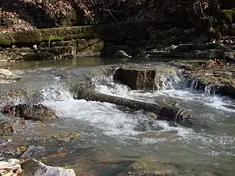 The Monroe City Creek was the water source for the Mill. Until 1856, it was known as Ryan's Creek. In 1800, Kinney built a dam on the creek about 200 yards upstream. The dam was 15' tall and collected water which was channeled to the mill through a wooden trough. Remains of the dam can still be seen. Due to frequent flooding, the dam was unsustainable.
