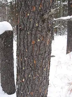 Mountain pine beetles affect pine trees by laying eggs under the bark. The beetles introduce blue stain fungus into the sapwood that prevents the tree from repelling and killing the attacking beetles with tree pitch flow. The fungus also blocks water and nutrient transport within the tree. On the tree exterior, this results in popcorn-shaped masses of resin, called "pitch tubes", where the beetles have entered.[13] The joint action of larval feeding and fungal colonization kills the host tree within a few weeks of successful attack (the fungus and feeding by the larvae girdles the tree, cutting off the flow of water and nutrients). In recent years, drought conditions have further weakened trees, making them more vulnerable and unable to defend against attack. When the tree is first attacked, it remains green. Usually within a year of attack, the needles will have turned red. This means the tree is dying or dead, and the beetles have moved to another tree. Within three to four years after the attack, very little foliage is left, so the trees appear grey.[7]