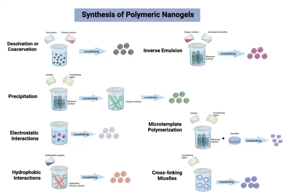 The synthesis of nanogels can be achieved using a vast array of different methods. However, two critical steps typically included in each method are polymerization and crosslinking, with physical and chemical crosslinking the most common.[4] These steps can be completed concomitantly or in sequential order depending on the synthesis method and eventual nanogel application.[4] Here, several different synthesis mechanisms are described briefly.