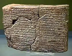 - Kashshaya (Akkadian: Kaššaya)[97] – attested in several economic documents from Nebuchadnezzar's reign as "the king's daughter".[98] Her name is of unclear origin; it might be derived from the word kaššû (kassite).[99] Kashshaya is attested from contemporary texts as a resident of (and landowner in) Uruk.[31] Kashshaya is typically, although speculatively, identified as the daughter of Nebuchadnezzar who married Neriglissar.[91][100]
