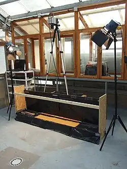 Typically, when working with living animals, a race track is prepared and covered with a substrate, which allows for the production of footprints, i.e. sand of varying moisture content,[1] clay [2][4] or mud.[5] After preparation, the animal is lured or shooed over the race track. This results in the production of numerous footprints that constitute a complete track. In some cases the animal is filmed during track production in order to subsequently study the impact of the animal's velocity or its behavior on the produced track.[2] This poses an important advantage of working with living animals: changes in speed or direction, resting, slippage or moments of fright become visible in the produced tracks. After track production and prior to reuse, the track can be photographed, drawn or molded. Changes in the experimental setup are possible throughout the experiment, i. e. regulation of the moisture content of the substrate. As an alternative, also tracks of free living animals can be studied in nature (i.e. nearby lakes) and without any special experimental setup.[3] However, without the standardized environment of the lab, matching the tracks with the behavior of the animal during track production is undoubtedly harder.