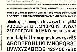 Indra Kupferschmid, an expert on German and Swiss printing history, describes it as a “reworking of “Neue Moderne Grotesk”, originally ca. 1909 by Wagner & Schmidt, Leipzig. Initially issued by Haas under the name “Accidenz-Grotesk”, later spelled “Akzidenz-Grotesk”. In 1943 Haas added a regular weight offered under the name “Normale Akzidenz-Grotesk”. In 1954, the whole family was revised and renamed “Normal-Grotesk”, also to prevent confusion with [the Berthold Type Foundry’s] Akzidenz-Grotesk.”[6][7] Several characters were reworked to make the forms more contemporary. At the same time, a range of text sizes were made available for the Linotype hot metal typesetting system. Kupferschmid notes that the original design was licensed by Wagner & Schmidt to a number of other European companies, so it "was cast by many European foundries in the early 20th century. Known as Wotan, Neue moderne Grotesk and Edel at Wagner companies/foundries, or – among many others – as Aurora at Weber, Accidenz-Grotesk (later Akzidenz-Grotesk and Normal Grotesk) at Haas, Breite halbfette Grotesk P at Böttger/Berthold, Elite-Grotesk at Poppelbaum, Favorit-Grotesk at Weisert, Moderne Grotesk at AG Schriftguss, Klassische Grotesk at Trennert Altona, Saturn at Schriftguss AG / Brüder Butter, Salon-Grotesk at Stempel, Cairoli from Nebiolo, Scania at Berling, or Grotesca Ideal at Gans (names differ depending on style/weight)."[8]