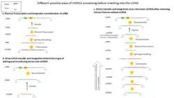 There are three possible ways that mtDNA can become prepared to be inserted into the nuclear DNA. The process mainly depends on the time mtDNA transfers into the nucleus.[34] Direct integration of unedited mtDNA fragments into the nuclear genomes is the most plausible, and is observed in plants, the Arabidopsis genome, and animals with the help of different methods, including BLAST-based analysis.[1][34] In this case, mtDNA is transferred into the nucleus while editing and the creation of introns occur later in the mitochondrion. If a gene was transferred to the nucleus in one lineage before mitochondrial editing evolved, but remained in the organelle in other lineages where editing arose, the nuclear copy would appear more similar to an edited transcript than to the remaining mitochondrial copies at the edited sites.[34] Another represented and less supported model is the cDNA-mediated model, in which intron-contained mtDNA enters the nucleus, and by reverse transcription of spliced and edited mitochondrial transcript, integrates into the nDNA.[1][34] The third proposed mechanism is the direct transfer and integration of intronless mtDNA into the nucleus, where editing and introns in the mitochondrion come and go during evolution. In this case, the introduction and removal of the intron, as well as reverse transcription, occur within mitochondria and the final product, the edited intronless mtDNA, integrates into nDNA after being transferred into the nucleus.[34]