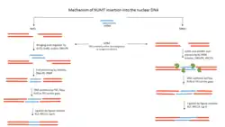 NUMT insertion into the nuclear genome and its persistence in the nuclear genome is initiated by the physical delivery of mitochondrial DNA to the nucleus.[5] This step follows by the mtDNA integration into the genome through a non-homologous end joining mechanism during the double-strand break (DSB) repair process as envisioned by studying Saccharomyces cerevisiae,[13][29] and terminates by intragenomic dynamics of amplification, mutation, or deletion, collectively known as post-insertion modifications.[5] The mechanism of mtDNA transfer into nucleus is not yet fully understood.