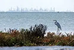 A diverse collection of birds sustained by the water life, such as the black skimmer, brown pelican, great blue heron, egret, laughing gull, roseate spoonbill, tern, and white ibis, can be found in the bay, especially near the mouth of Rincon Bayou.[20] Local efforts by the Coastal Bend Bays and Estuaries program have benefited bird populations by adding crushed oyster shells to the bay's small islands for improved nesting conditions,[21] and the restoration of marsh near the Nueces Bay Causeway to increase fish populations to satisfy the birds' dietary requirements.[22] At the nearby Nueces Delta Preserve, countless birds have been observed, as well as bobcats, coyotes, feral hogs, mountain lions, rattlesnakes, Texas spiny lizards, western diamondbacks, and white-tailed deer.[23]