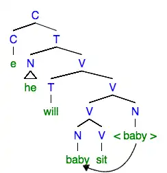 One highly-influential syntactic account for NI is the head-movement process proposed by Baker (1988).[11] This account states that this NI head movement is distinct from but similar to the better-established phenomenon of phrase movement and involves the movement of a head noun out of object position and into a position where it adjoins to a governing verb. An example of this movement can be seen in figure 1 where the head noun 'baby' is moved out of the object N position to become incorporated with the verb as the sister to the verb 'sit'. While this theory does not account for every language, it does provide a starting point for subsequent syntactic analyses of NI, both with and without head movement. A more recent paper by Baker (2007) addresses a number of other influential accounts including Massam’s pseudo-incorporation,[12] Van Geenhoven’s base generation,[13] and Koopman and Szabolcsi’s small-phrase movement.[14][15] The paper concluded that, while each account has their own strong points, they all fail to answer some important questions, thus requiring the continued use of Baker's head-movement account.[15]