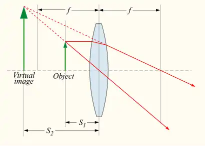 where S1 is the distance from the object to the lens, S2 is the distance from the lens to the image, and f is the focal length of the lens. In the sign convention used here, the object and image distances are positive if the object and image are on opposite sides of the lens.[52]