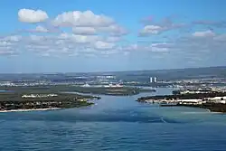 Pearl Harbor is an American lagoon harbor on the island of Oahu, Hawaii, west of Honolulu. It was often visited by the naval fleet of the United States, before it was acquired from the Hawaiian Kingdom by the U.S. with the signing of the Reciprocity Treaty of 1875. Much of the harbor and surrounding lands are now a United States Navy deep-water naval base. It is also the headquarters of the United States Pacific Fleet. The U.S. government first obtained exclusive use of the inlet and the right to maintain a repair and coaling station for ships here in 1887.[1] The surprise attack on the harbor by the Imperial Japanese Navy on December 7, 1941, led the United States to declare war on the Empire of Japan, marking the United States' entry into World War II.[2][3][4]