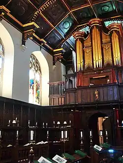 The Peterhouse Partbooks, music manuscripts from the early years of the Chapel, survive, and are one of the most important collections of Tudor and Jacobean church music. The Choir of Peterhouse has recently attracted wider interest for its regular performances of this material, some of which has not been heard since the 16th century, and have released a CD of music from the Caroline partbooks.[29] The Organ in the Chapel was installed in 1765 John Snetzler. During the nineteenth and twentieth centuries, the Organ was expanded and renovated by Hill & Son (1893-94) and Noel Mander (1963). In 2023, the Organ underwent a substantial restoration and renovation project by Flentrop and Klais. This restoration uniquely provides two mechanical-action consoles: one 'historic' console intended to recreate the experience of playing Snetzler's original instrument; the other a contemporary console, to allow for the performance of a wider range of repertoire.[30]