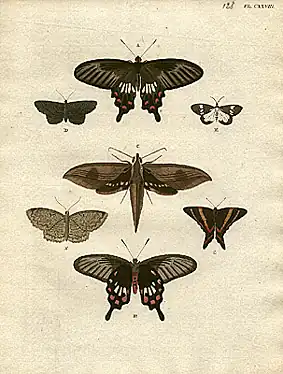 Pieter Cramer (21 May 1721 (baptized) – 28 September 1776) was a wealthy Dutch merchant in linen and Spanish wool, remembered as an entomologist. A bachelor, he was born in Amsterdam, and lived on Oudezijds Voorburgwal at no. 131, close to the Oude Kerk.[1] In 1760 he had bought the house, then known as "the Three Kings". Cramer was the director of the Zealand Society, a scientific society located in Flushing, and a member of Concordia et Libertate, based in Amsterdam. This literary and patriotic society, where Cramer gave lectures on minerals, commissioned and/or financed the publishing of his book De uitlandsche Kapellen, on foreign (exotic) butterflies, occurring in three parts of the world Asia, Africa and America.[2]