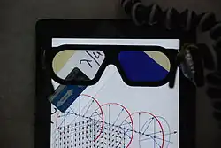 Polarized 3-D projection was demonstrated experimentally in the 1890s. The projectors used Nicol Prisms for polarization. Packs of thin glass sheets, angled so as to reflect away light of the unwanted polarity, served as the viewing filters.[7] Polarized 3-D glasses only became practical after the invention of Polaroid plastic sheet polarizers by Edwin Land, who was privately demonstrating their use for projecting and viewing 3-D images in 1934.[8] They were first used to show a 3-D movie to the general public at "Polaroid on Parade", a New York Museum of Science and Industry exhibit that opened in December 1936. 16 mm Kodachrome color film was used.[9][10][11] Details about the glasses are not available. At the 1939 New York World's Fair, a short polarized 3-D film was shown at the Chrysler Motors pavilion and seen by thousands of visitors daily. The hand-held cardboard viewers, a free souvenir, were die-cut in the shape of a 1939 Plymouth seen head-on. Their Polaroid filters, stapled over rectangular openings where the headlights ought to be, were very small.[12]