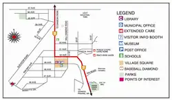 Highway 2 runs north–south through Pouce Coupe, connecting the town to Dawson Creek (10 km (6.2 mi) northwest) and Alberta (29 km (18 mi) southeast). Pouce Coupe's internal street network has 14 km (8.7 mi) of paved and 5 km (3.1 mi) of unpaved road.[20] The village's commercial activities are centered on the bend in highway. The residential areas are located mostly south of the highway with a gridiron layout. Industry is located north of the highway and agriculture to the west.