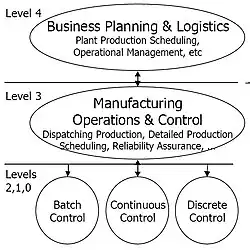 - Level 4 — Business logistics systems — Managing the business-related activities of the manufacturing operation. ERP is the primary system; establishes the basic plant production schedule, material use, shipping and inventory levels. Time frame: months, weeks, days, shifts.