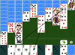 Try to build ascending from the aces on the 8 foundations and use the Klondike red on black alternating-colour rule to build cascades. If stuck, draw card by card from the stock to the waste. The game allows you to recycle the waste stack exactly one time. Empty cascades can accept any card (easy variation) or only Kings (harder variation).