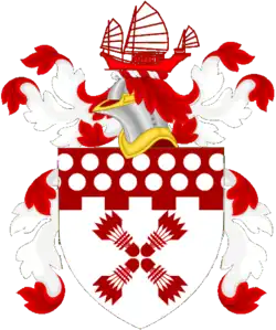 A three-masted Chinese junk Gules sails unfurled Argent.