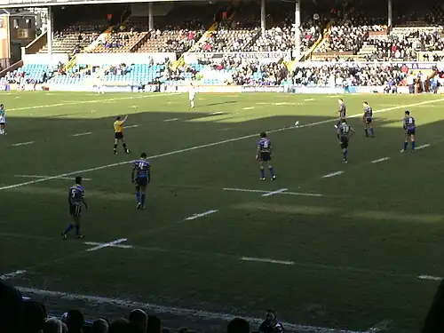On 5 May 1954, 102,569 spectators watched the 1953–54 Challenge Cup Final replay at Odsal Stadium, Bradford, England, setting a new record for attendance at a rugby football match of either code.[17] Also in 1954, the Rugby League World Cup, the first for either code of rugby, was formed at the instigation of the French. In 1966, the International Board introduced a rule that a team in possession was allowed three play-the-balls and on the fourth tackle a scrum was to be formed. This was increased to six tackles in 1972 and in 1983 the scrum was replaced by a handover.[19] 1967 saw the first professional Sunday matches of rugby league played.