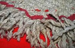 Sheep's wool, or mah-too-EHL-kel, is the most common material used for modern Salish weaving. Some knitters still buy shorn fleeces and go through most of the traditional preparation, but most buy the washed and carded wool directly from a commercial carding mill.[7] The fleece is lightly washed in a tub of tepid water and then hung outside to dry. It is then teased or picked apart with fingers to remove any matted areas and loose dirt. The wool is then carded, leaving the wool in soft batts, where the fibers lie lengthwise. Taken to the spinning machine, the wool is deftly hand fed into the axle of the spindle. This separates sections of the batt of wool and allows the desired amount of spinning to take place before the tension is eased to wind the wool onto the spindle. When the spindle has filled, the wool is unwound and stored in balls or skeins.[5]