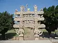 The Satavahana Empire under Satakarni II conquered eastern Malwa from the Shungas.[39] This gave the Satavahanas access to the Buddhist site of Sanchi, in which they are credited with the building of the decorated gateways around the original Mauryan Empire and Sunga stupas.[40] From the 1st century BCE, the highly decorated gateways were built. The balustrade and the gateways were also colored.[6] Later gateways/toranas are generally dated to the 1st century CE.[26]