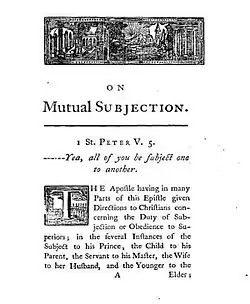 "On Mutual Subjection" was first given on 28 February 1718, and it was first printed in 1744.[22] Its introductory passage from scripture comes from First Epistle of Peter 5:5 – "--Yea, all of you be subject one to another."[23]