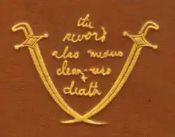 ![]() Tooling on the cover of the first public printing, showing twin scimitars and the legend: "the sword also means clean-ness + death" | |