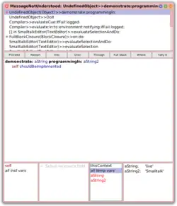 An example of how Smalltalk can use reflection is the mechanism for handling errors. When an object is sent a message that it does not implement, the virtual machine sends the object the doesNotUnderstand: message with a reification of the message as an argument. The message (another object, an instance of Message) contains the selector of the message and an Array of its arguments. In an interactive Smalltalk system the default implementation of doesNotUnderstand: is one that opens an error window (a notifier) reporting the error to the user. Through this and the reflective facilities the user can examine the context in which the error occurred, redefine the offending code, and continue, all within the system, using Smalltalk-80's reflective facilities.[31][32]