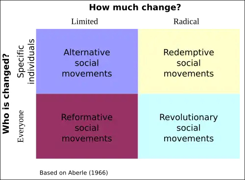 Political science and sociology have developed a variety of theories and empirical research on social movements.[6] For example, some research in political science highlights the relation between popular movements and the formation of new political parties[7] as well as discussing the function of social movements in relation to agenda setting and influence on politics.[8] Sociologists distinguish between several types of social movement examining things such as scope, type of change, method of work, range, and time frame.[9]
