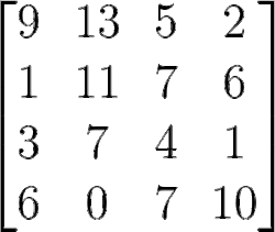 A square matrix of order 4. The entries form the main diagonal of a square matrix. For instance, the main diagonal of the 4×4 matrix above contains the elements a11 = 9, a22 = 11, a33 = 4, a44 = 10.