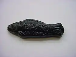 Salmiak-flavored black Swedish Fish or "salted herring", with the manufacturer's name "Malaco" embossed.