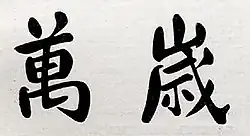 Classically, the phrase wansui is repeated multiple times following a person's name or title. For example, in ancient China, the Emperor would be addressed with (Chinese: 吾皇萬歲,萬歲,萬萬歲; pinyin: Wú huáng wànsuì, wànsuì, wànwànsuì; lit. '[May] my Emperor [live and reign for] ten thousand years', 'ten thousand years', 'ten thousand of ten thousand years'). The foregoing phrase is best known to modern Chinese through televised films, but is not historically accurate; in the Ming dynasty, the only occasion during which 萬歲 is used is the great court, which was held one to three times a year.[6] Approaching the end of the ceremony, the attending officials will be asked to shout 萬歲 three times.