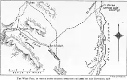 The Ottoman front line had been strengthened after the Second Transjordan attack. It began in the south, where Ottoman cavalry guarded tracks to Madaba before continuing with strongly wired entrenchments. In front of these, advanced posts extended from the foothills opposite the ford across the Jordan River at Makhadet Hijla to about 4 miles (6.4 km) north of the Jericho to Es Salt road. The road had been cut at the Ghorianyeh Bridge before the First Transjordan attack, in the vicinity of Shunet Nimrin. The front line was strengthened by advanced posts which were also wired on the left flank at Qabr Said, Kh. el Kufrein and Qabr Mujahid. From their right flank in the foothills a wired line of redoubts and trenches facing south ran from 8,000 yards (7,300 m) north of Shunet Nimrin, across the Jordan Valley to the Jordan River, 1,000 yards (910 m) south of the Umm esh Shert ford.[12][13][14] This line was continued west of the river by a series of individual "wired-in redoubts with good fields of fire,"[15] then as a series of trenches and redoubts along the northern or left bank of the Wadi Mellaha. These were followed by a "series of trenches and redoubts towards Bakr Ridge which were entrenched but not wired. A strong advanced position of well built sangars and [sic] [which were] wired in was held at Baghalat."[13] Bakr Ridge in the Judean Hills was situated to the west of the salient at El Musallabe which was held by the EEF. The Ottoman front line was supported by entrenched positions on Red Hill beside the Jordan River, which was also the site of their main artillery observation point.[12][13][14]