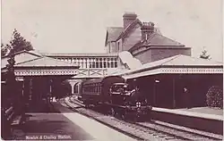 Despite the closure of the line from Lewes to East Grinstead in 1958, Horsted Keynes station remained open as the terminus of the line from Haywards Heath. By the time this line had closed in 1963, the Bluebell Railway was operating trains into the station from Sheffield Park. The station has been restored to reflect the 1920s, when it was operated by the Southern Railway[56] and the main station building is a Grade II listed building.[57] The station buildings are standard Myres design with a two-storey stationmaster's house with brick ground floor and tilehung first floor and a single-storey booking hall to the left. The booking hall has a decorated wooden gabled porch with stained glass windows.[57] The canopies on the platforms adjacent to the booking office are original while that on the island platform has been rebuilt from material salvaged from Lavant and Hassocks.[57][58]