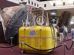 Designed and built by Tim Cole out of kevlar and carbon with a clear bubble hatch. His local Greeley partners helped with materials and building including: Agland, Purdy-Minch Construction and Maxanns.[3] About the size of a closet, the Spirit-of-Freedom capsule has a bench and a sleeping bag. Fossett averaged 4 hours of sleep per day in 45 minute naps. He ate military rations called MREs which were heated with water activated chemical heat packs.[4] Fossett would have to regularly climb out into the sub-zero temperatures to change fuel tanks.[6] Besides the Comstock autopilot, the gondola equipment included GPS, Inmarsat, and satellite phone backup for communications with Mission Control at Washington University in St. Louis. Fossett used radios for communications with air traffic control and other aircraft. An Emergency Position Indicating Rescue Beacon (EPIRB) was on board to aid search and rescue.[4] The unpressurized gondola used lithium batteries to power the electronic equipment and a custom heater regulating the aircraft internal temperature between 4 and 21 C (38-72 F).[4]