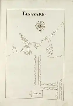Tenavaram's gold-copper gilded roofs earned it fame amongst pilgrims and sailors, due to navigational purposes and its contribution to the town's appearance as a "golden city." Encompassed by a quadrangular cloister which opened under verandahs and terraces to the various deities' shrines, the complex contained gardens of shrubs and trees which priests used to pluck offerings to the deities.[2][21] The Portuguese historian Diogo do Couto stated that along with Adam's Peak, Tenavarai was the most celebrated temple on the island, and the most visited pilgrimage site of the south with a circuit of a full league, while his fellow Portuguese historian De Quieroz compares the temple port town's splendor to that of the Koneswaram temple of Trincomalee and states that Lord Vishnu was the primary deity of the destroyed shrine of Tenavarai.[22][23]