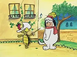 Touché Turtle (voiced by Bill Thompson, known for voicing Droopy) and his dim-witted sheepdog sidekick Dum Dum (voiced by Alan Reed, known for voicing Fred Flintstone) were a pair of heroic fencers who battle villains and heroically save kings, queens, and others in distress.[2] Touché was the brave (if not entirely competent) leader brandishing his trusty sword and exclaiming his catchphrase "Touché away!"[3] He wore a plumed musketeer-type hat. Dum Dum was more of a simple-minded follower in a smaller plumed hat and a scarf.