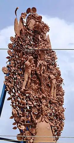 The most traditional of the trees of life contains a number of vital images. At the top of the sculpture, an image of God is placed. Underneath are images relation with the creation of the world in seven days, such as the sun and moon, the animals and Adam and Eve. The serpent from the Biblical story also appears, as does the Archangel Gabriel at the bottom, who casts out Adam and Eve from the Garden of Eden.[1] Overall, the tree sculpture looks something like a candelabra.[5] The trees are made primarily for religious and decorative use. Those that contain incense burners are more likely to be use religiously. In Izucar de Matamoros, these trees appear in processions such as those for Corpus Christi.[6]