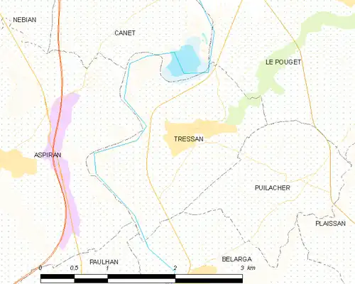 Tressan is located on the road between Gignac and Pézenas, extending across a hill in the Hérault Valley.