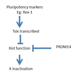 The marker Rex1, as well as other members of the pluripotency network, are recruited to the Tsix promoter and transcription elongation of Tsix occurs.[10] Along with Tsix and other proteins, factor PRDM14 has been shown to be necessary for the return to pluripotency. Assisted by Tsix, PRDM14 can associate with Xist and remove the inactivation of an X chromosome.[11]